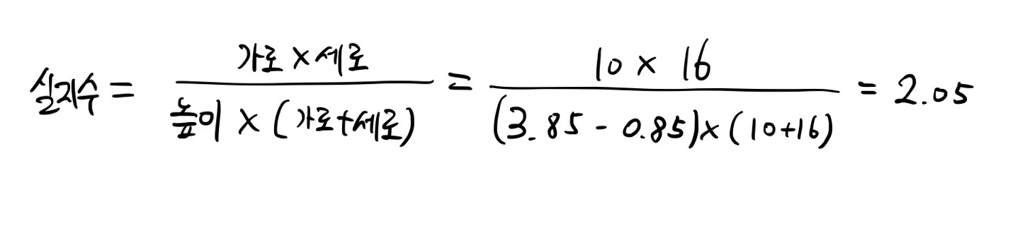 다음과 같은 공식으로 구한다, 실지수를 구할 때, 높이는 작업면으로부터 등이 얼마나 떨어져 있는지를 기준으로 하므로, 천장 높이에서 작업면 높이를 빼서 구한다.