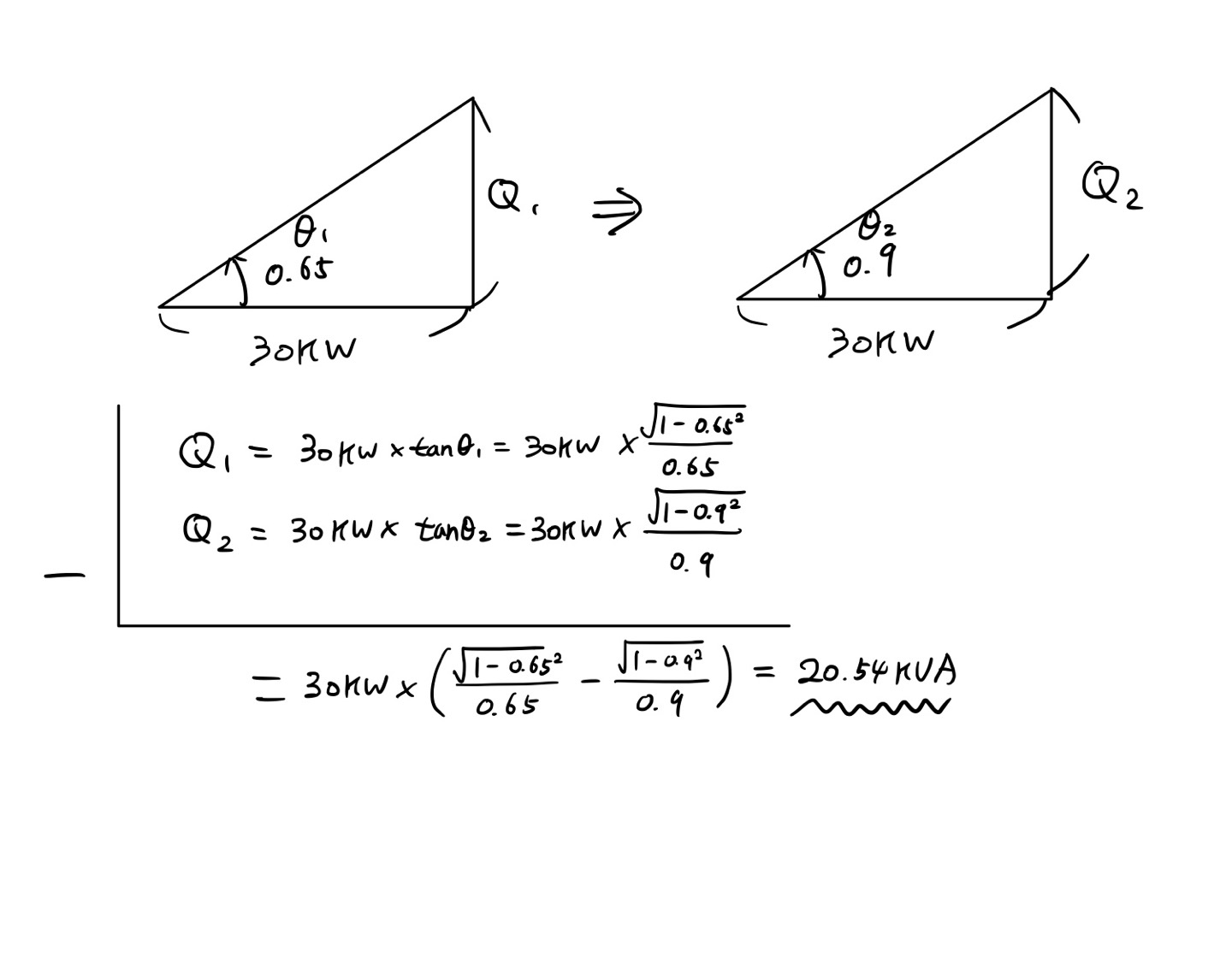 (3) 어느 공장의 3상 부하가 30kW이고, 역률이 65%이다. 이것의 역률을 90%로 개선하려면 전력용 콘덴선 몇 KVA가 필요한가?