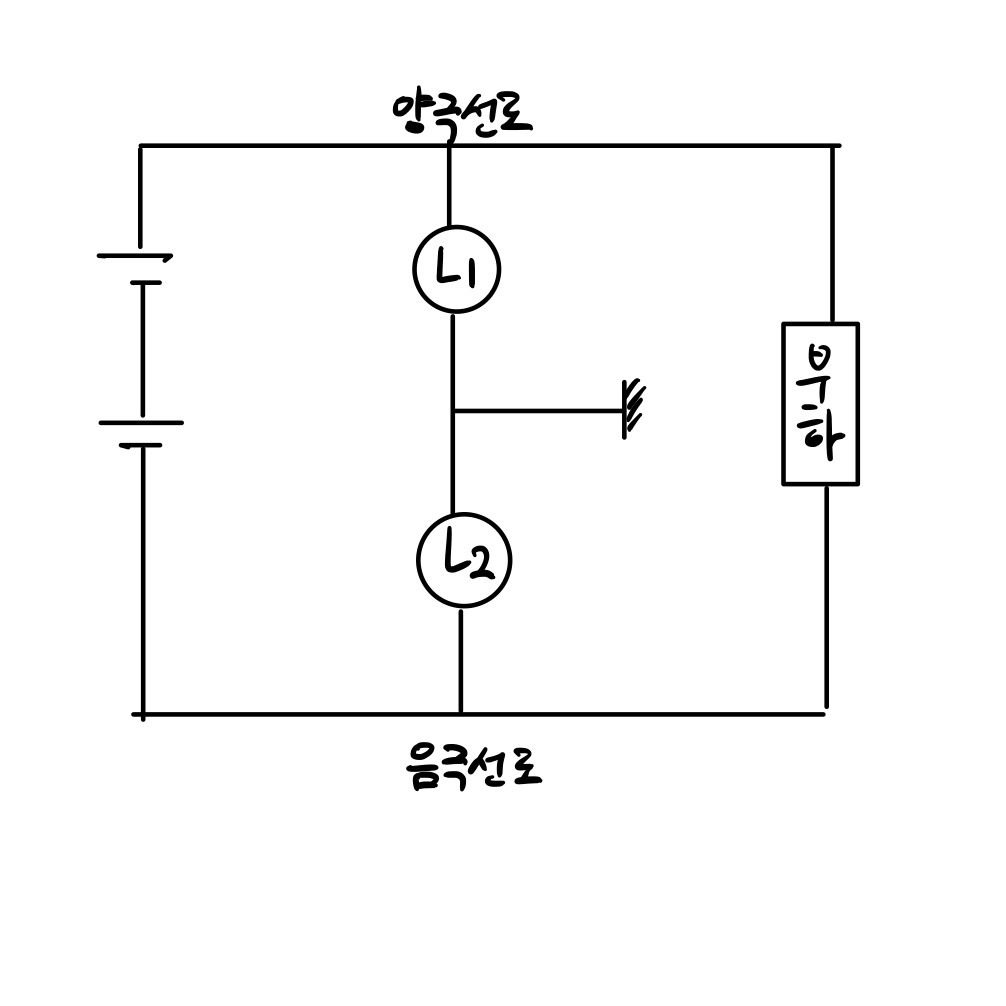 양극 음극 모두 접지가 추가되면, L1,L2사이에 전압차가 모두 0이 되므로, 전류가 흐르지 않게 된다. 따라서 모두 소등