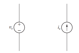 이상전원은 다시 두가지로 나뉘어지는데, 독립전원과 종속전원으로 나뉘어진다. 아래 그림은 독립 전원을 나타낸 것으로, 원형의 모양으로 전원을 표시한다. 독립의 의미는 회로의 다른 소자 혹은 전류/전압에 영향을 받지 않고, 독립적으로 전원을 인가한다는 것이다.