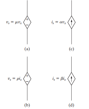 (a)를 보면 Vs가 Vx에 상수를 곱한 값으로 결정된다. 이를 영어로 표현하면 Voltage Controlled Voltage Source(VCVS)라 한다. 직역하면, 전압에 의해 조절되는 전압원으로, 전압원이 회로의 다른곳에 걸린 전압에 의해 값이 결정된다는 것이다.