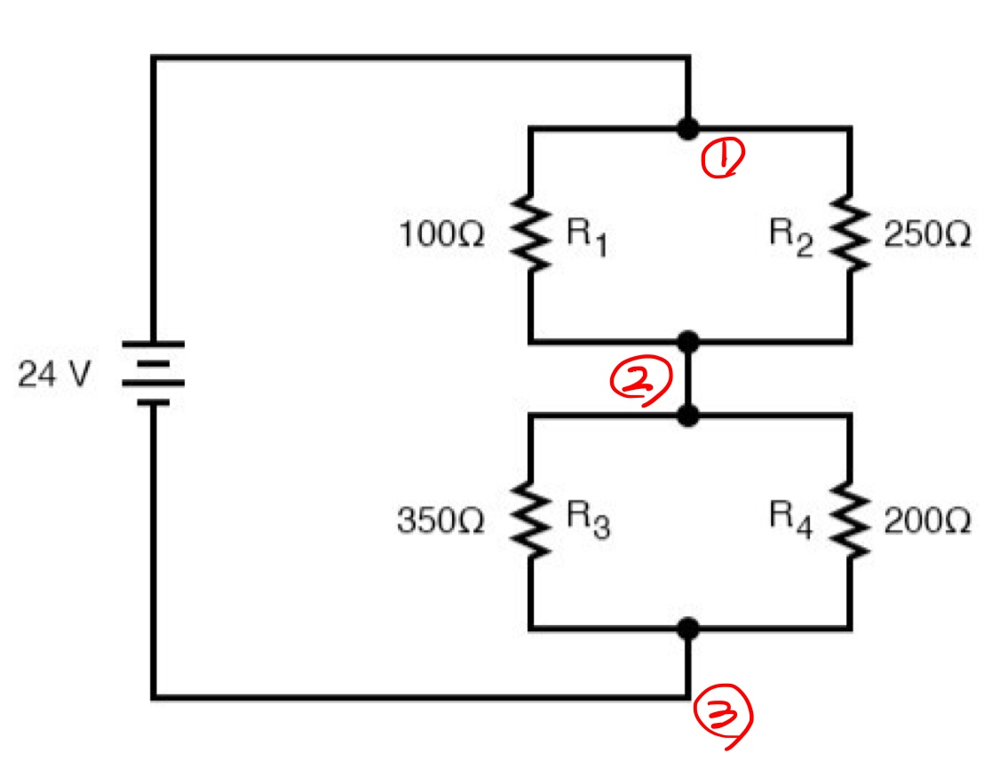 위 그림은 직렬과 병렬이 혼합된 회로이다. 일단 보기 쉬운 병렬부터 생각하자. R1과 R2는 1번과 2번 노드를 공통으로 연결하였기에, R1, R2는 병렬이다. 마찬가지 이유로 R3, R4도 병렬이라 말할 수 있다.