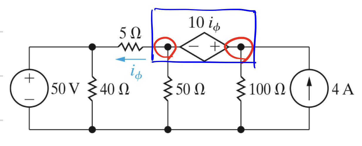 해당 Supernode에서 KCL을 적용하게 되면, 50, 5, 100옴을 지나는 전류와 가장오른쪽의 전류원의 4A가 모두 합쳐서 Supernode로 들어가는 전류와 나가는 전류합이 0이 되게 된다.