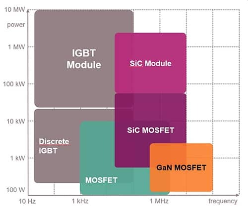 위 표는 가로축이 주파수, 세로축이 전력으로 물질 특성에 따라 소자들을 구성했을 때, 사용가능한 영역을 나타낸 것이다. 우리가 흔히 쓰는 mosfet의 경우 스위칭을 빠르게 할 수 있다는 장점이 있지만, 고전압/고전력에서는 약한 모습을 보여준다. 따라서 IGBT, SiC, GaN등을 활용하여 소자를 구성한다면, 더 높은 주파수, 더 높은 전력에서 스위칭을 할 수 있다.