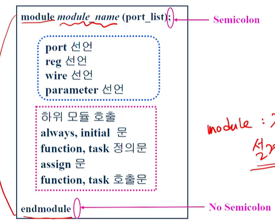 모듈은 위와 같은 구성을 가지고 있으며, module ~ endmodule 사이에 여러개의 module이 들어갈 수도 있음