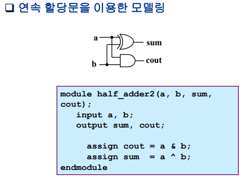 assign 문을 활용한 모델링 방법이다. 하드웨어 적인 코딩 특성에 따라 assign문의 순서가 바뀐다고 해도 동일한 회로가 생성된다. 위 그림은 반가산기를 모델링 한 것으로 input 에 a,b output에 sum과 count을 두고, cout 과 sum을 a,b 비트의 연산을 통해 assign 해주면 위와 같은 회로를 모델링 하게 된다.