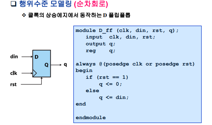 영어로는 behavioral modeling으로 한국어로 번역했을 때에는 조금 어색한 감이 있다. 필자도 이게 무슨 의미인지 모르고 단순히 always 구문을 쓰면 행위수준 모델링으로 생각하였다. 좀 더 자세히 찾아보니, 설계의 기능을 알고리즘 위주로 작성하는 방식이 행위수준 모델링이라고 한다. 이 모델링 방법에는 initial 구문과 always 구문을 주로 쓰게 된다.