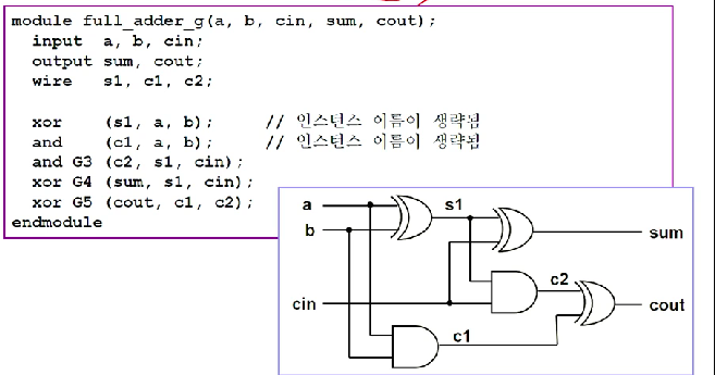 and G3 (c2, s1, cin); //gate-primitive를 활용하여 and 게이트 선언 후 포트할당(이름 G3)