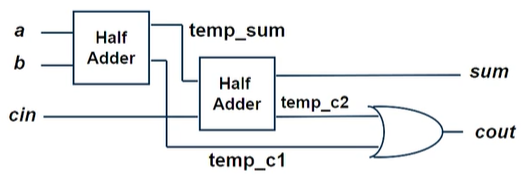 크게 먼저 half adder 모듈이 필요하고, 전체 top모듈에서 half adder 모듈을 인스턴스 하여 전체 회로를 구성하는 방식으로 코드를 작성하면 되겠다. 먼저 half adder 모듈이다.