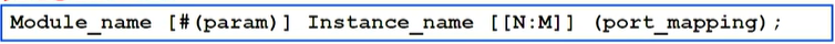 ((port_mapping) : 인스턴스된 모듈안에 값을 매핑하는 과정이다. 포트매핑은 두가지 방법으로 이루어진다. 순서에 의한 매핑과 이름에 의한 매핑이 바로 그것이다. 설계자의 스타일에 따라 달라지지만, 이름에 의해 매핑하는 것이 직관적으로 더 보기 쉽다고 한다. 이름에 의한 매핑방법은 다음과 같이 작성한다.