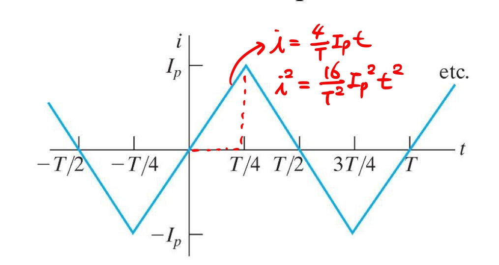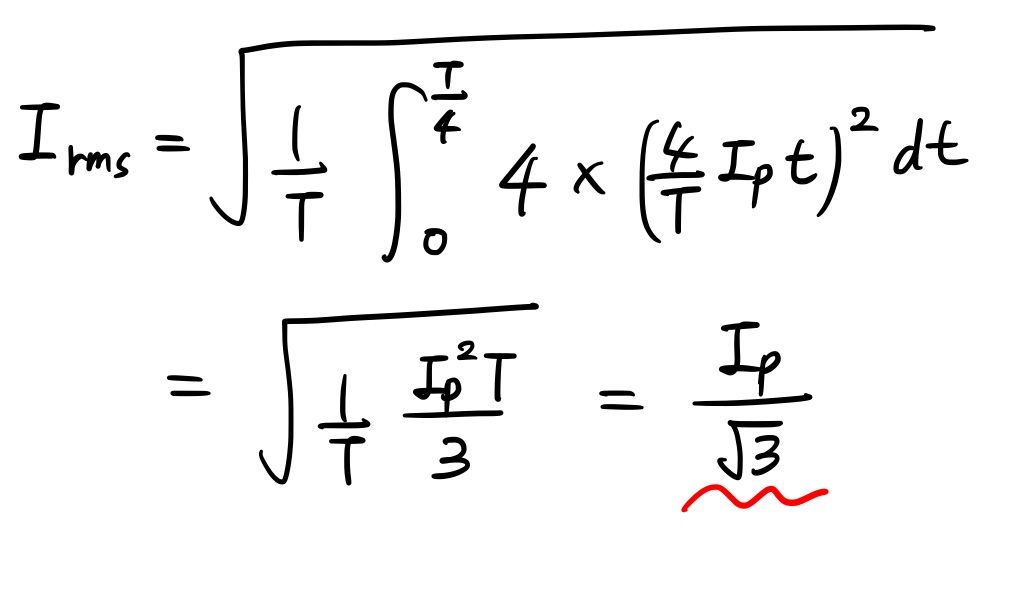앞에서 배운 RMS의 정의를 활용하면 된다. 이 함수의 식을 구해서, 제곱하여 적분 한 뒤 주기로 나눠주고 마지막에 제곱근을 씌우면 된다. 다만, 여기서는 대칭성을 활용할 수 있으므로, 제곱한 값을 적분할 때에 잘 생각해보면, 직선을 제곱한 형태인 2차함수를 적분하는 것과 동일하고, 제곱했으므로 부호 역시 +가 되기 때문에, 주기의 1/4만 구해서 4배를 해주면 적분값을 알 수 있다.