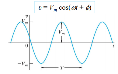 가장 기본적인 교류전압을 나타낸 것이다. 최대값이 +와 - 양쪽으로 Vm 을 가지며, cos 안에는 각주파수와 위상차(파이)가 들어있다. 수학시간에 배운 기본적인 sin 파형의 성질을 그대로 가져가며, 주기는 T, w = 2*파이*주파수 형태를 갖는다.