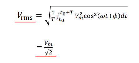 교류에서는 RMS값을 적용하여 계산하는 경우가 많다. RMS에 대한 수학적인 정의는 Root Mean Square로, 직역하면 제곱평균제곱근 이라는 말이 된다. 이를 수식으로 표현하면 다음과 같이 표현 할 수 있다.(예시는 cos함수를 기준)