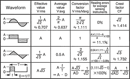 RMS 값은 실효값(Effective Value)이라고도 전기이론에서는 이야기한다. 아래 그림은, 여러가지 주기함수 파형을 갖는 교류에서 실효값, 평균값등을 나타낸 자료이다. 첫번째줄의 Effective Value가 RMS값이라고 생각하면 되겠다.