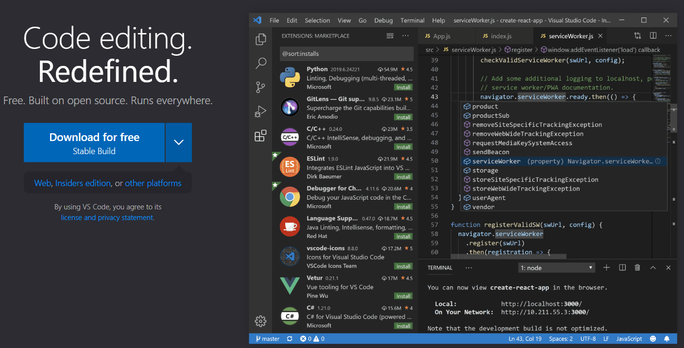 Visual Studio Code is a code editor redefined and optimized for building and debugging modern web and cloud applications. Visual Studio Code is free and available on your favorite platform - Linux, macOS, and Windows.