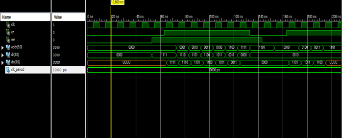 signal clk : std_logic := '0'; --입력signal 선언 clk,en,we,addr(4bit),di(4bit) 모두 0으로 초기화됩니다.