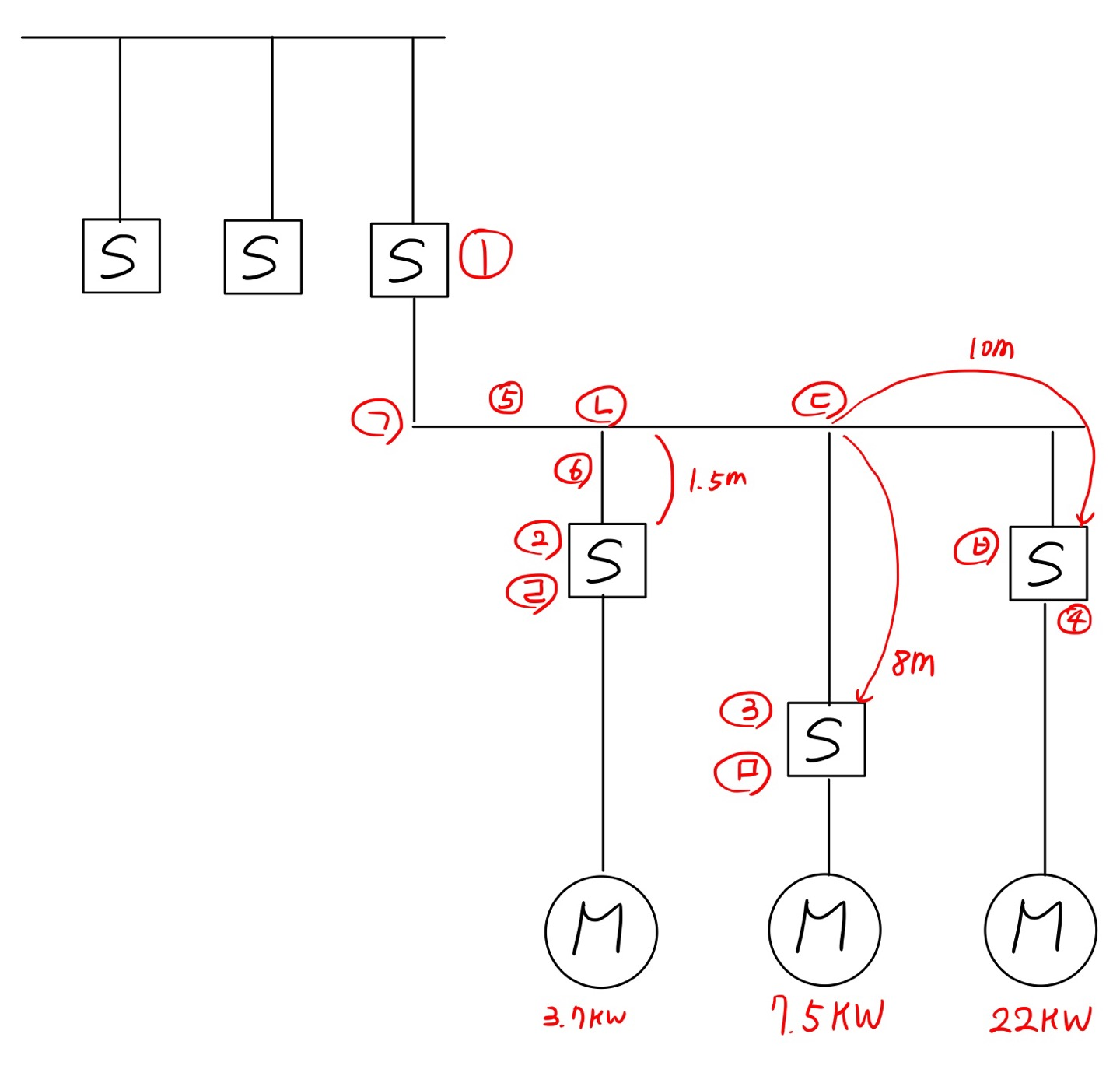 전기기사 2022. 5. 31. 22:371. 3.7kW 와 7.5kW의 직입기동 농형 전동기 및 22kW의 기동기 사용 권선형 전동기 등 3대를 그림과 같이 접속하였다. 이때 다음 각 질문에 답하시오. 단, 공사방법 B1 으로 XLPE절연전선을 사용하였으며, 정격전압은 220V이고 간선 및 분기회로에 사용되는 전선도체의 재질 및 종류는 같다고 한다.