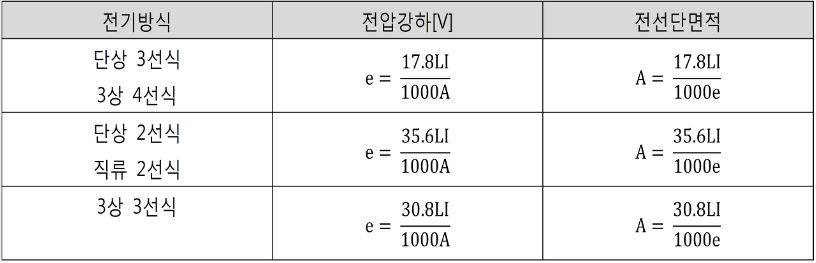 아래 표는 전압강하와 전선단면적 선정시 공식을 작성한 것이다. 외워두도록 하자. 17.8,35.6, 30.8