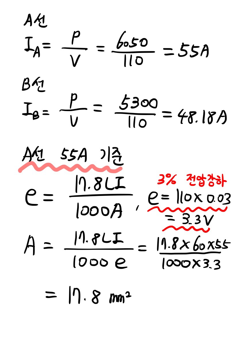 단상 3선식이므로, 상전압인 110을 기준으로 하여 계산을 진행하고, A선과 B선 모두 전류를 구한 뒤, 큰 전류를 기준으로 하여 전선의 굵기를 선정한다.